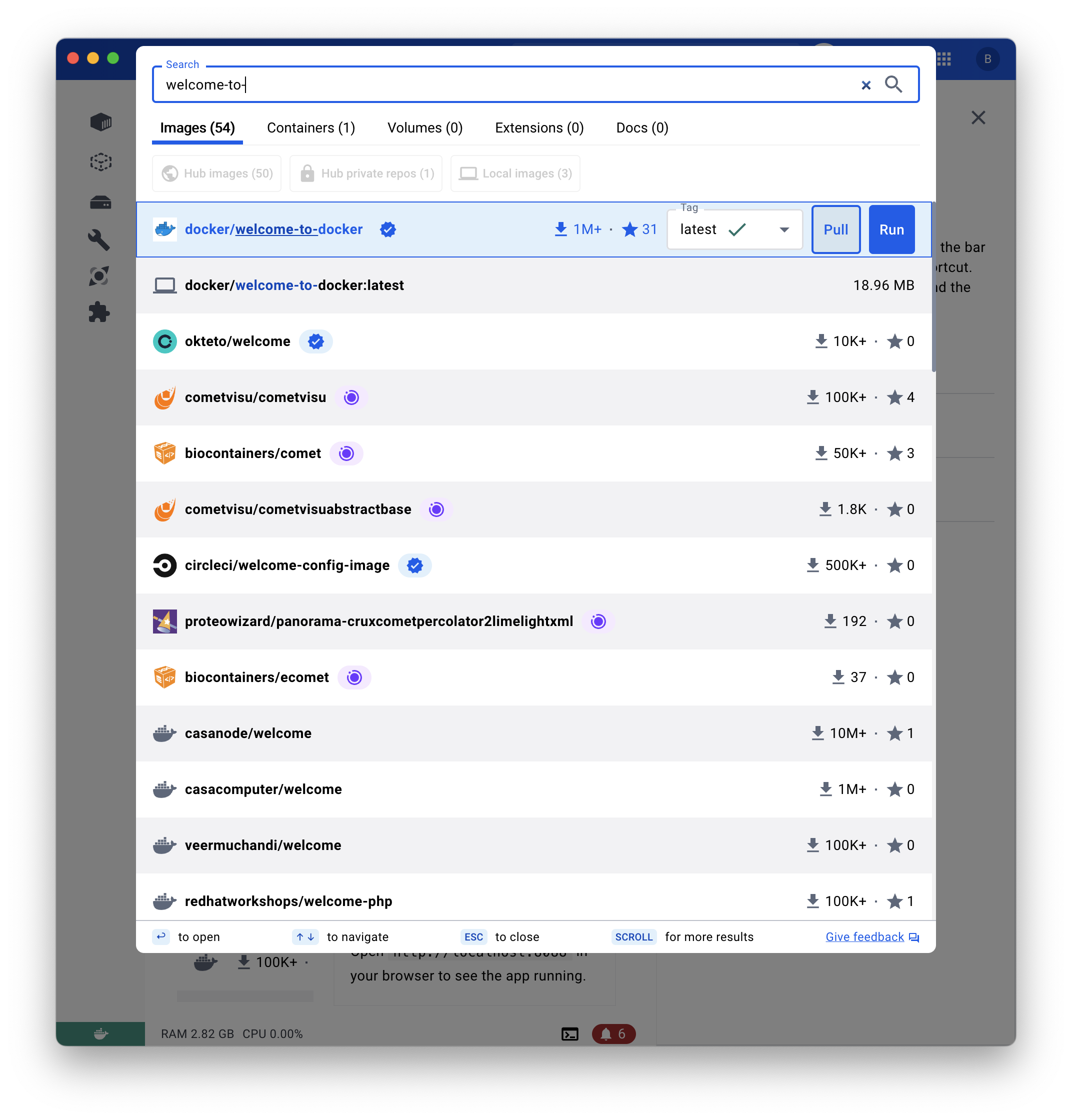 Docker Image의 저장소이자 공유 플랫폼입니다. Github와 비슷합니다. Docker Image를 Docker Hub에 업로드하고 공개된 저장소는 다른 사람들이 쉽게 Pull 해 사용할 수 있습니다. Docker Desktop 앱에서 cmd + k를 입력해 찾고자 하는 image 이름을 검색하면 hub에서 검색된 image들이 검색됩니다!